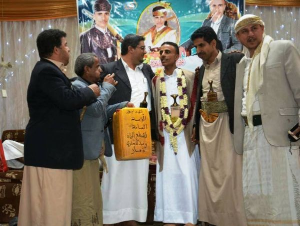 وقدم النشطاء والحقوقيين والصحفيين هدية لزميليهم العريس مكونة من "دبة ماء" عشرون لتر، تعبيرا عما يعانيه سكان مدينة ذمار من انقطاع دائم للمياه في ظل عجز مؤسسة المياه عن القيام بدورها.