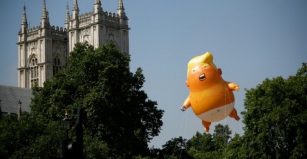 وفي حين أن جونسون وترامب متقاربان سياسيا، سمح خان هذا الاسبوع لمتظاهرين باطلاق بالون عملاق على علو ستة امتار بلون برتقالي لافت، يمثل طفلا يضع حفاضات وله ملامح ترامب فوق ساحة البرلمان في لندن الجمعة.