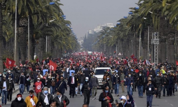 حشدت كتلة النهضة البرلمانية الرئيسية في تونس آلاف المتظاهرين، السبت، في تظاهرة لدعم الحكومة وسط خلاف سياسي محتدم مع رئيس الجمهورية قيس سعيد.