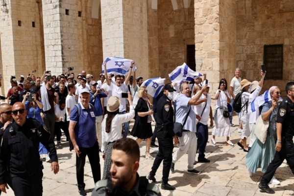 وكان ألفا مستوطن قد اقتحموا صباح اليوم تمهيدا للمسيرة باحات المسجد الأقصى المبارك بحماية من قوات الاحتلال، في حين أخلت الأخيرة منطقة باب العامود واعتقلت عشرات الفلسطينيين.
