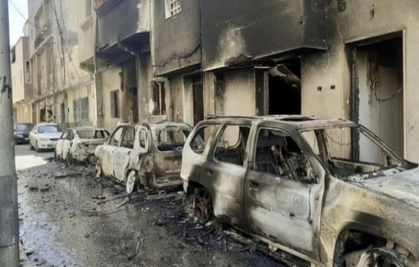 ونشرت مواقع تواصل اجتماعي مقاطع فيديو تظهر تبادل النيران في منطقتي "باب بن غشير" و"شارع الزاوية" وسط المدينة، واحتراق سيارات في أحد الأحياء.
