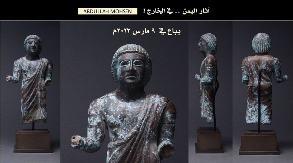 قال الباحث في مجال الآثار عبدالله محسن، إن تمثالا برونزيا لرجل قيادي من سبأ اليمن، سيُعاد عرضه للبيع في مزاد أمريكي للآثار بعد يومين.