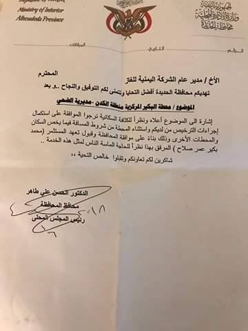 ووفقا للوثيقة التي حصل "يمن شباب نت"، على نسخة منها، فقد وجة محافظ الحديدة، الحسن طاهر، باعتماد محطة مركزية، لعضو مجلس النواب الموالي للانقلاببين، محمد بكير عمر صلاح، حيث وجه المحافظة، مدير شركة الغاز بمأرب، اعتماد محطة بكير المركزية للغاز في الكدن، مديرية الضحى.