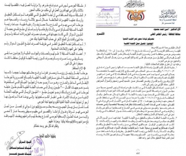 وكشفت وثيقة سرية، عن أن لجنة التحقيق المكلفة من محافظ تعز بدأت عملها في اليوم التالي من تكليفها، وطلبت من رئيسة اللجنة الطبية المتعلقات والعهد والإخلاءات، إلا أن المحافظ قام بتغيير رئيس اللجنة وكيل أول عبدالقوي المخلافي، وكلف الوكيل اللواء عبدالكريم الصبري بديلا عنه، ومن ثم استبدله بالوكيل رشاد الأكحلي.. مشيرة إلى أن كل هذه التغييرات والتعيينات في شهر واحد، وهو ما تسبب بحالة إرباك وضاعف معاناة الجرحى وأخر دور التسليم.
