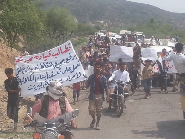 نظم أبناء عزلة الكلائبة التابعة لمديرية المعافر جنوبي تعز، اليوم الثلاثاء، مظاهرة جماهيرية نددوا فيها بالاعتداءات التي تتعرض لها المنطقة من قبل مجاميع "أبو العباس" المسلحة.