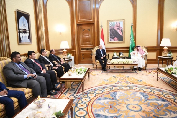 ظهر الرئيس هادي ونائبة على محسن صالح ورئيس الحكومة معين عبد الملك مساء اليوم الأحد خلال لقاء مع العاهل السعودي سلمان بن عبدالعزيز، بعد أربعة أيام من المعارك بالعاصمة المؤقتة عدن (جنوب اليمن)، إنتهت امس السبت بسيطرة ميلشيات الانتقالي الإماراتي على غالبية مقار الحكومة هناك