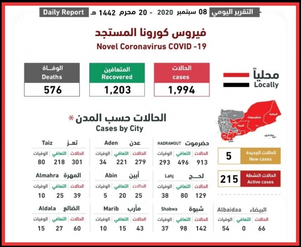 وبذلك تبلغ الحصيلة الكلية للحالات المؤكدة بفيروس كورونا 1994 حالة، منها 576 حالة فاة، و1203 حالة تعافي، ولا تشمل هذه الأرقام المناطق التي تسيطر عليها ميلشيات الحوثي، حيث مازالت نخفي أي بيانات عن الوباء.