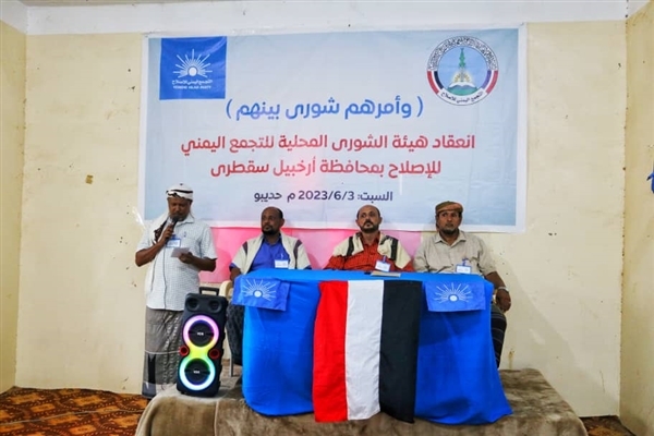 جاء ذلك خلال انعقاد هيئة الشورى المحلية للتجمع اليمني للإصلاح بأرخبيل سقطرى، السبت، دورتها الأولى؛ وذلك استنادًا للنظام الأساسي واللوائح الداخلية للحزب.